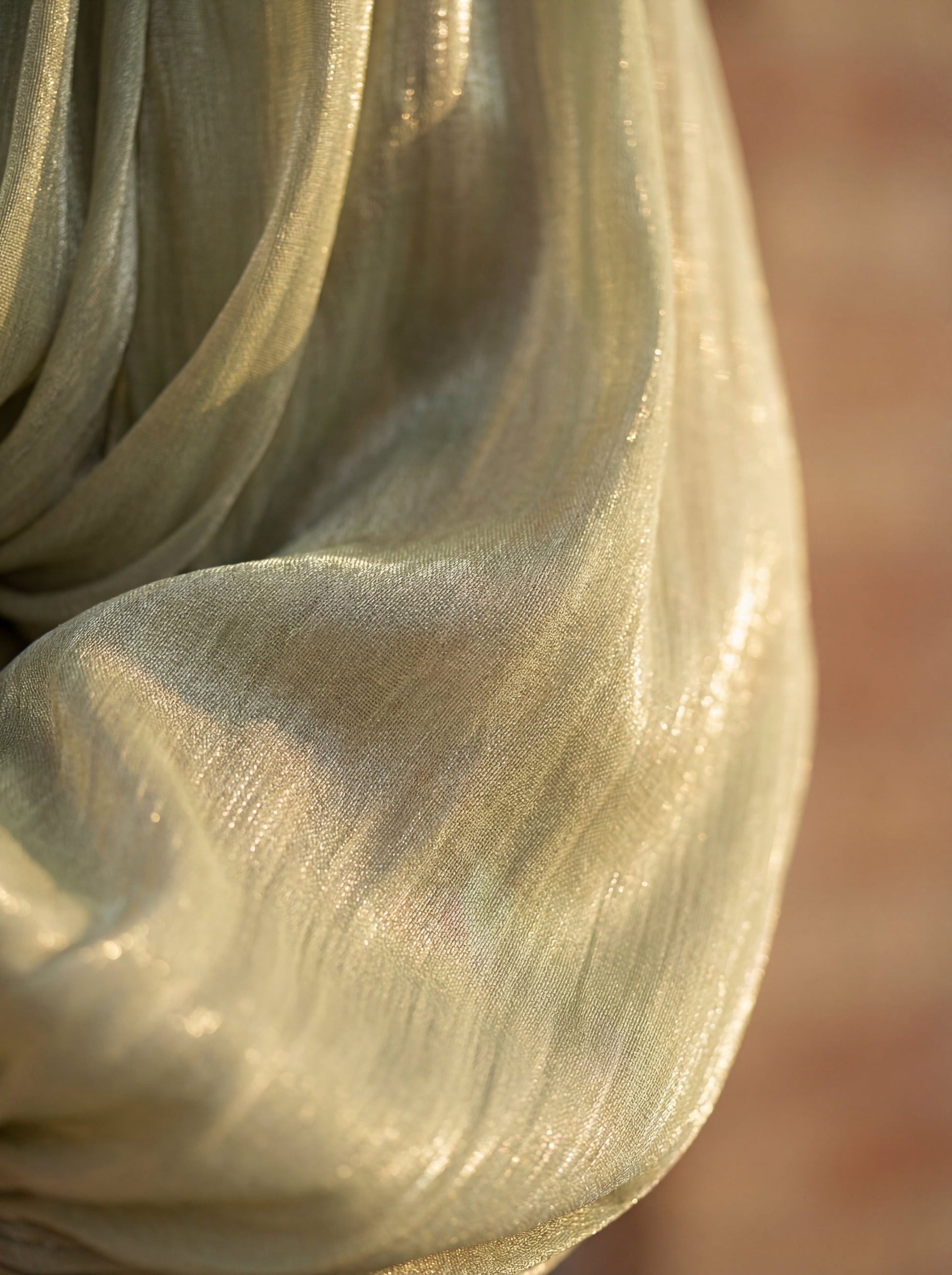 Composición: 100% poliéster (satén con hilo metalizado para efecto shimmer).